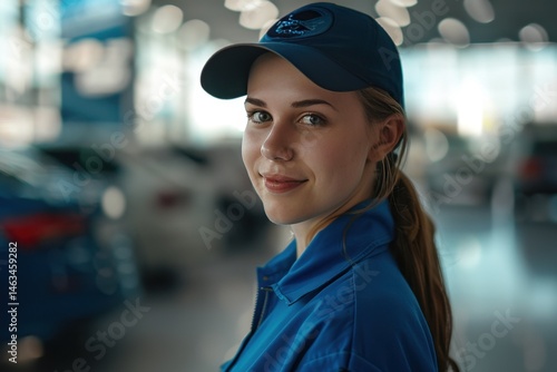 Young female car salesperson smiling confidently in a modern dealership showroom.