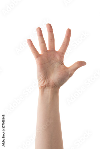 Young female hand counting five isolated on white