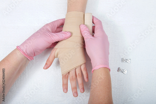Young female hands wearing pink gloves wrapping elastic ace bandage on young hand and wrist. Medical treatment.