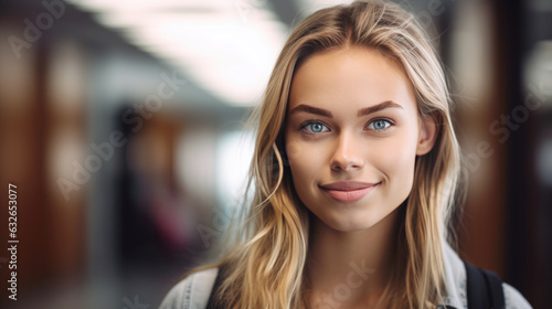Young female student stands in the background of a campus hallway. Created with Generative AI technology.