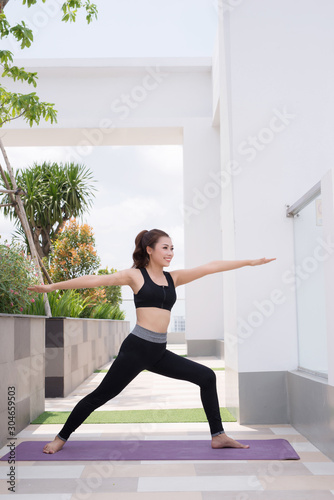 Young fit woman in sportswear practicing yoga exercises on terrace