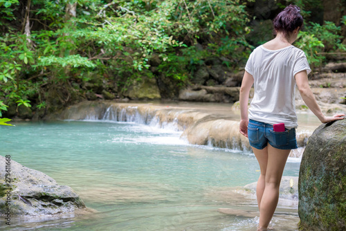 Young girl traveling at beautiful Erawan waterfall National Park Kanchanaburi, Thaialnd