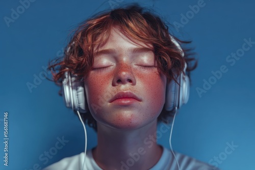 Young girl with curly hair and closed eyes listening to music wearing headphones isolated on blue background.
