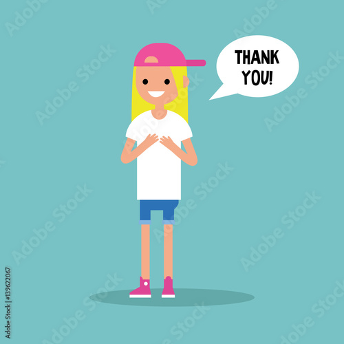Young grateful blond girl says "Thank you" / flat editable vector illustration