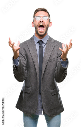 Young handsome business man over isolated background crazy and mad shouting and yelling with aggressive expression and arms raised. Frustration concept.