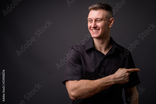 Young handsome businessman smiling and pointing finger