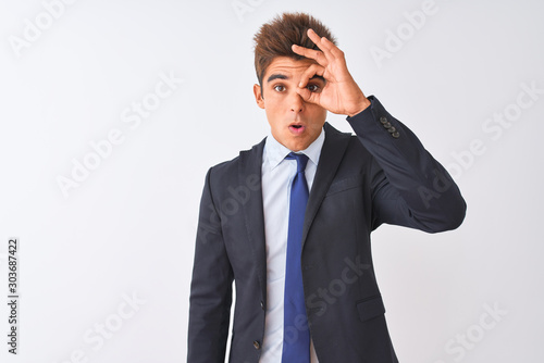Young handsome businessman wearing suit standing over isolated white background doing ok gesture shocked with surprised face, eye looking through fingers. Unbelieving expression.