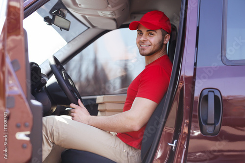 Young handsome man delivering pizza in car