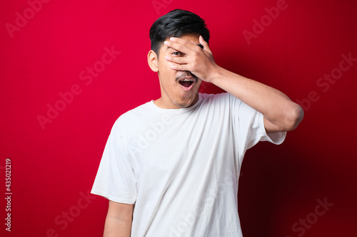 Young handsome man peeking in shock covering face and eyes with hand, looking through fingers with embarrassed expression.