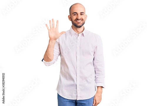 Young handsome man wearing elegant shirt showing and pointing up with fingers number five while smiling confident and happy.