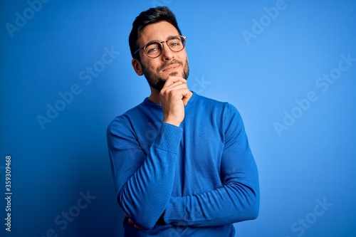 Young handsome man with beard wearing casual sweater and glasses over blue background looking confident at the camera smiling with crossed arms and hand raised on chin. Thinking positive.