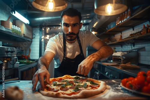 Young handsome pizzaiolo guy making pizza. Pizzeria kitchen