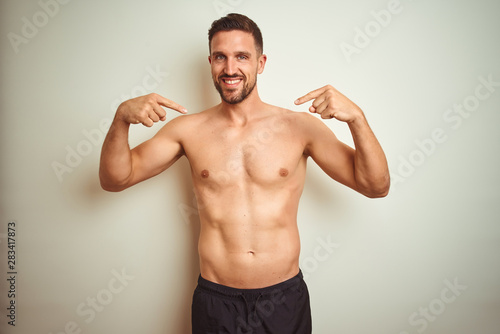 Young handsome shirtless man over isolated background looking confident with smile on face, pointing oneself with fingers proud and happy.