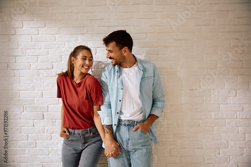Young happy couple holding hands while standing against wall.