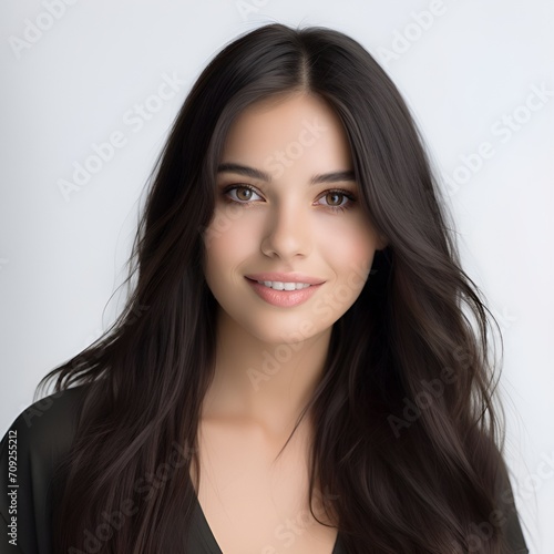 young happy long black haired woman posing and looking in camera,white background