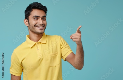 Young happy man in yellow polo pointing finger up to side on light blue background