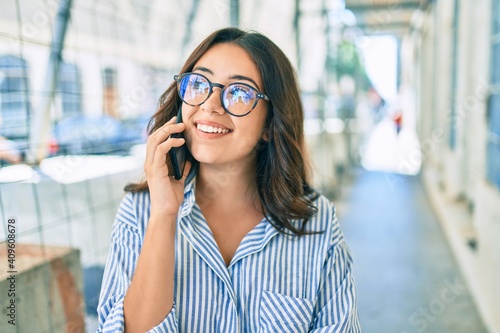 Young hispanic businesswoman smiling happy talking on the smartphone at the city.