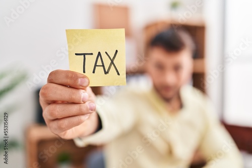 Young hispanic man business worker holding tax reminder paper at office