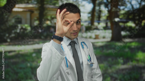 Young hispanic man doctor wearing white uniform coat and stethoscope makes ok sign with his hand in park outdoors; approval confidence.