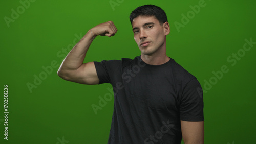 Young hispanic man flexes bicep and inspects muscle in studio against vibrant green backdrop; confidence.