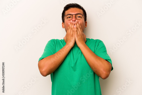 Young hispanic man isolated on white background shocked, covering mouth with hands, anxious to discover something new.