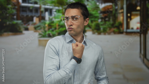 Young hispanic man outdoors in a modern park wearing glasses and a watch, posing confidently with a fist gesture, surrounded by greenery and architecture in a casual attire setting.