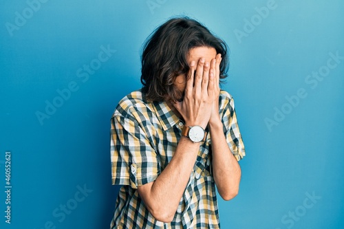 Young hispanic man wearing casual clothes with sad expression covering face with hands while crying. depression concept.