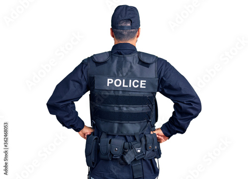 Young hispanic man wearing police uniform standing backwards looking away with arms on body