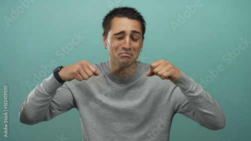 Young hispanic man wearing wristwatch holds fists to eyes in crying gesture inside blue studio set; sadness.