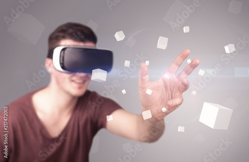 Young impressed man wearing virtual reality goggles with grey cubes around him