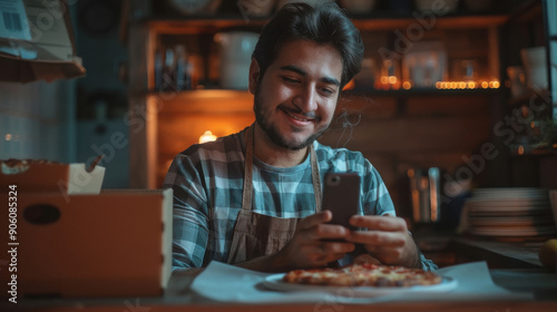 young indian man using smartphone with eating pizza