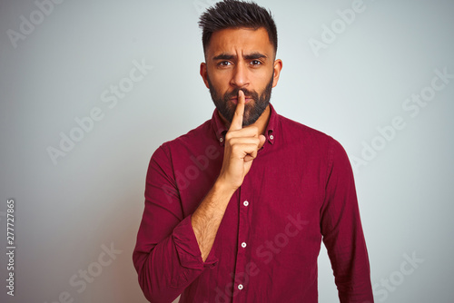 Young indian man wearing red elegant shirt standing over isolated grey background asking to be quiet with finger on lips. Silence and secret concept.