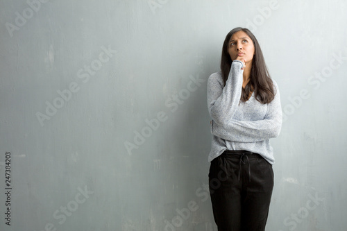 Young indian woman against a grunge wall doubting and confused, thinking of an idea or worried about something