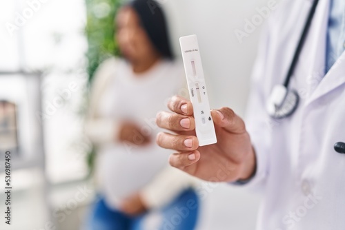 Young latin couple doctor and patient having medical consultation holding antigen test at clinic