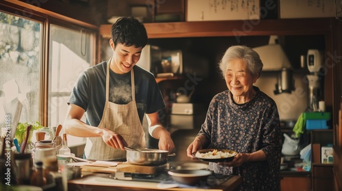 Young man and elderly woman joyfully cooking together in a warm, inviting kitchen filled with natural light.