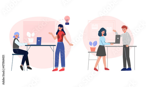 Young Man and Woman Office Employee Engaged in Workflow Vector Scene Set