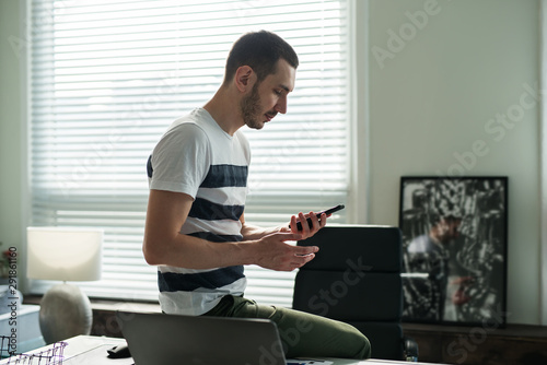Young man businessman stands next to a work desk and looks at his phone in the office