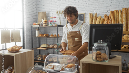 Young man in a bakery prepares a pastry in an indoor shop environment showcasing various types of bread and baked goods