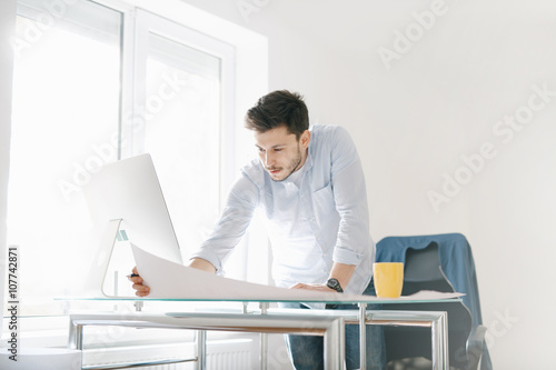 Young man in a modern office design sketching construction project design in a note book computer and drinks coffee