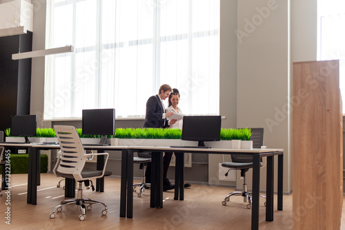 young man in business suit reading report and talking with african american female boss in office, office workers and colleagues communicating and working together with papers
