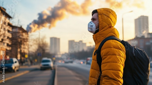 Young Man in Yellow Jacket Wearing Mask Against Urban Pollution