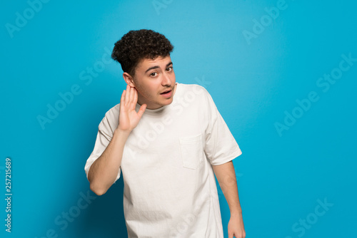 Young man over blue background listening to something by putting hand on the ear