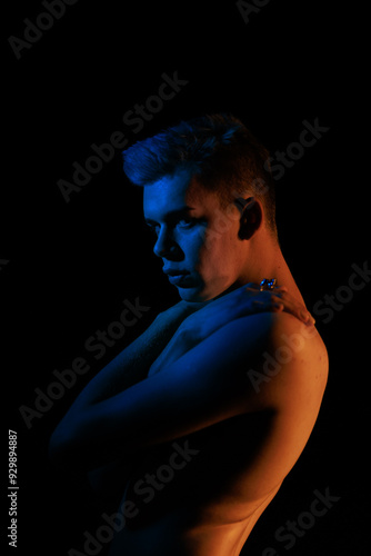 Young man posing in the dark with red and blue light in the studio
