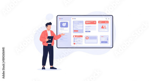 Young Man Presenting Social Media Dashboard on Large Screen