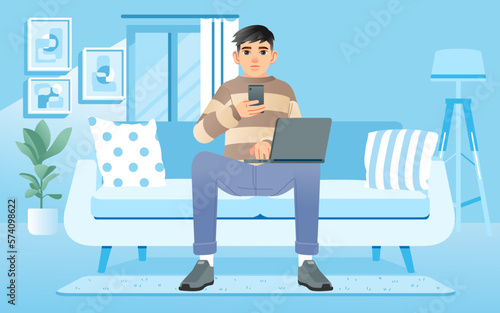 Young man sitting with laptop on sofa at home Work on the computer Freelance online education or social media concept