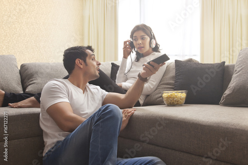 Young man watching TV while woman listening music sitting on sofa