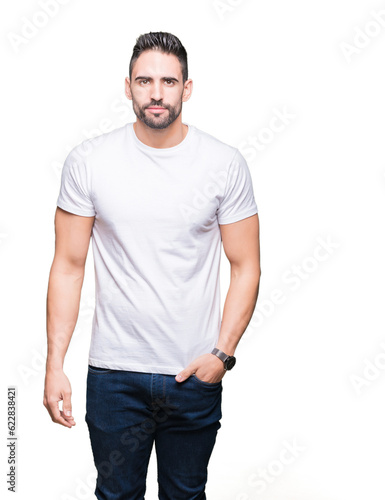 Young man wearing casual white t-shirt over isolated background Relaxed with serious expression on face. Simple and natural looking at the camera.