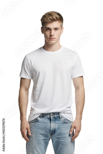 Young man wearing white t-shirt and blue jeans, isolated on transparent background