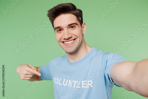 Young man wears blue t-shirt white title volunteer doing selfie shot pov on mobile cell phone point on himself isolated on plain pastel green background. Voluntary free team work help grace concept.