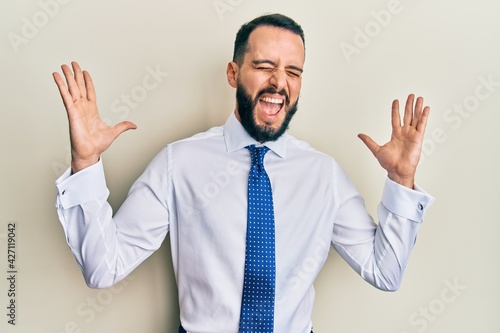 Young man with beard wearing business tie celebrating mad and crazy for success with arms raised and closed eyes screaming excited. winner concept